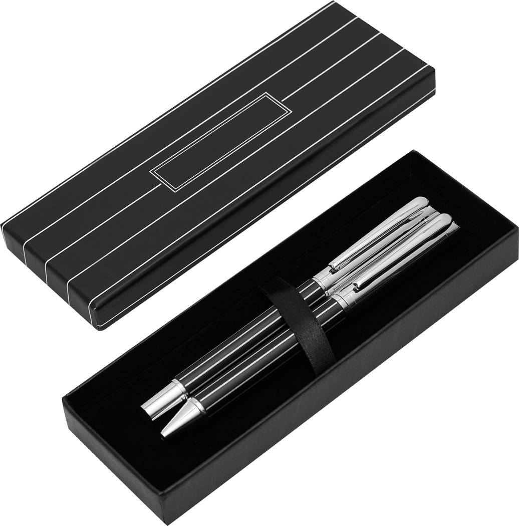 Set d´écriture ADORNO: comprend un roller métal (encre noire) avec capuchon et grip noir et un stylo métal (encre bleue), livraison dans un étui assorti