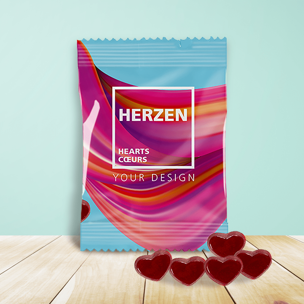 Un cadeau qui vient directement du cœur. Délicieux bonbons en forme de cœurs fruités au goût de framboise. Fabriqués à partir de concentré de jus de fruits, d'arômes naturels et d'extraits végétaux colorants, ils sont emballés dans un petit paquet que vous pouvez personnaliser. Parfaits pour offrir ou inclure dans les sacs à goodies pour faire la promo de votre entreprise.