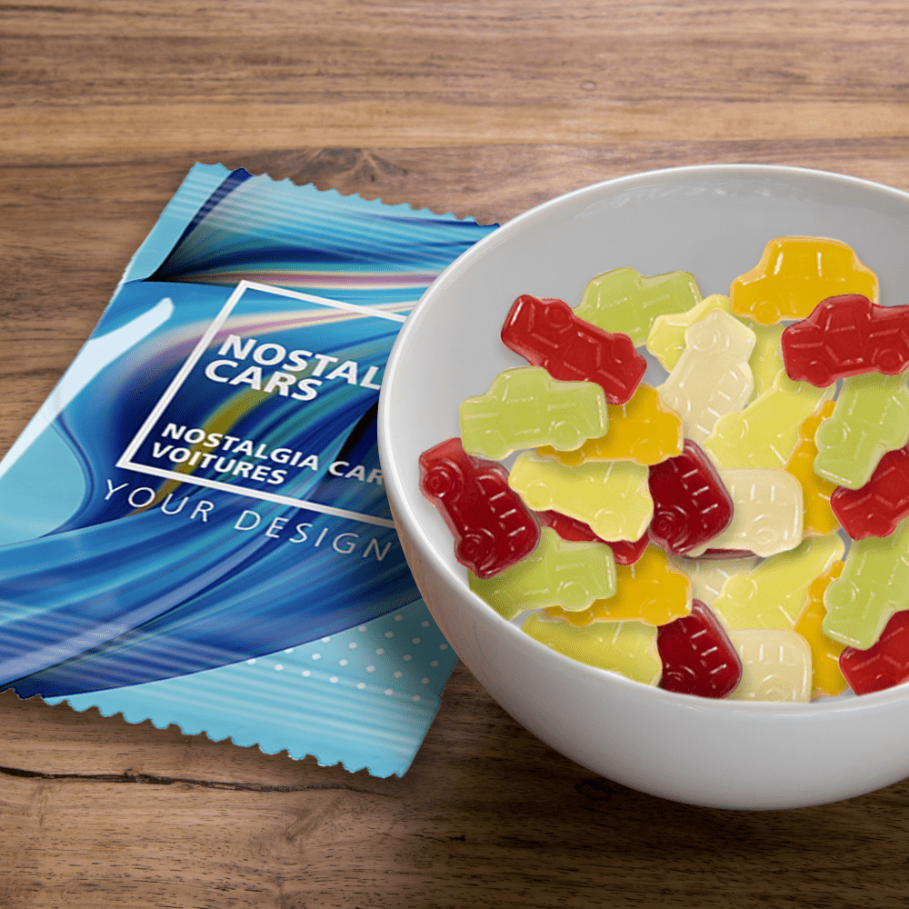 Créez votre propre emballage de bonbons en forme de voiture et obtenez différents parfums : cerise, citron, orange, fruit de la passion, ananas et framboise. Concevez l'emballage en fonction de la marque de votre entreprise ou de votre événement. Propulsez votre marketing vers l'avant et vers l'avenir avec des voitures en gomme de fruit personnalisées.