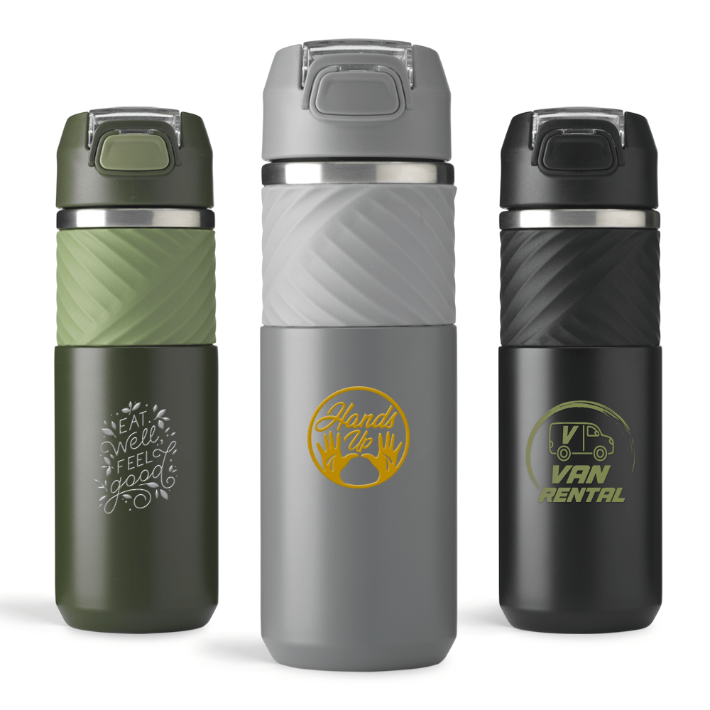 Faites un choix responsable avec cette bouteille à double paroi en acier inoxydable recyclé. Elle comporte un bouchon à vis étanche, une gorgée en silicone repliable avec une paille et un couvercle à bouton-poussoir fermé hygiéniquement avec un verrou. Idéal pour faire de l'exercice ou pour les trajets en voiture. La poignée antidérapante en caoutchouc ajoute une commodité supplémentaire, tandis que son design élégant mais robuste se distingue.