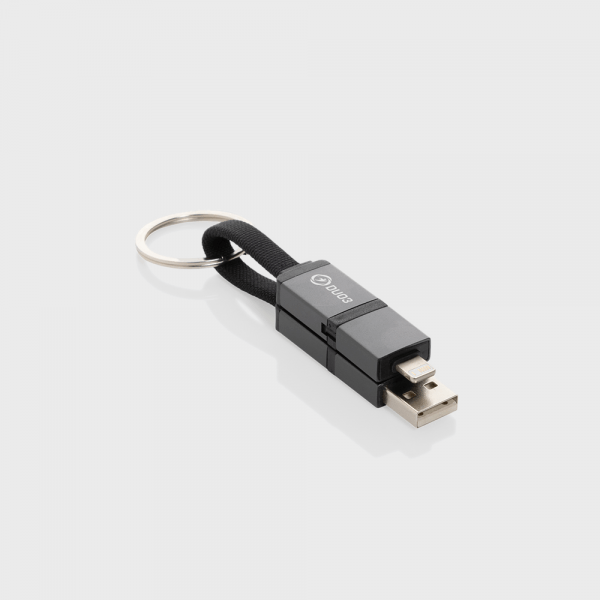 Rechargez rapidement avec ce câble porte-clés 4-en-1 pratique. Fabriqué à partir de matériaux recyclés pour votre confort et rapidité. Équipé d'entrées USB A et Type C, ainsi que de sorties IOS et Type C, il est idéal pour une variété d'appareils. Ce câble offre une charge rapide de 60W et s'attache facilement à vos clés. Les connecteurs magnétiques le gardent bien rangé. Sans PVC, avec emballage sans plastique, il est plus respectueux de l'environnement.