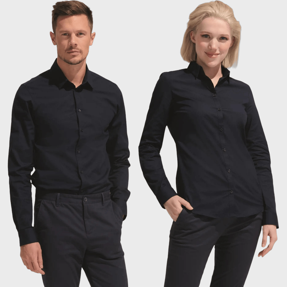 Restez confortable et élégant avec cette chemise en popeline stretch facile à entretenir. Elle comporte un col classique moderne et une patte de boutonnage à 8 boutons pour un look épuré. La version homme a 2 boutons aux poignets et des pinces à la taille et au dos. La version femme offre une coupe ajustée avec des pinces devant et derrière et un seul bouton aux poignets. Parfaite pour toutes les occasions, décontractées ou formelles. Personnalisez votre chemise dès aujourd'hui !