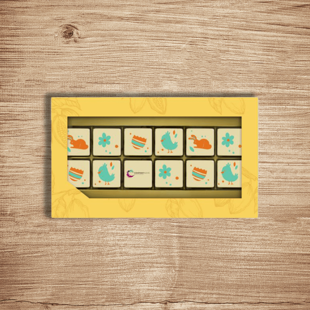 Personnalisez ce coffret de chocolat pour les fêtes de Pâques ! Il contient 12 ou 18 carrés de chocolat au lait avec 4 motifs de Pâques différents, sur l'un de 12 chocolats vous pourrez imprimez le logo de votre marque en quadrichromie et offrir ce cadeau original à vos proches ou vos clients !