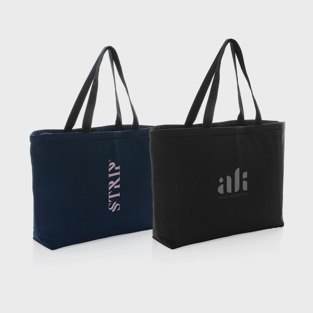 Ce grand sac isotherme en toile recyclée et en acétate de polyéthylène-vinyle assure que vos produits de pique-nique et boissons préférées restent fraîches en déplacement.
