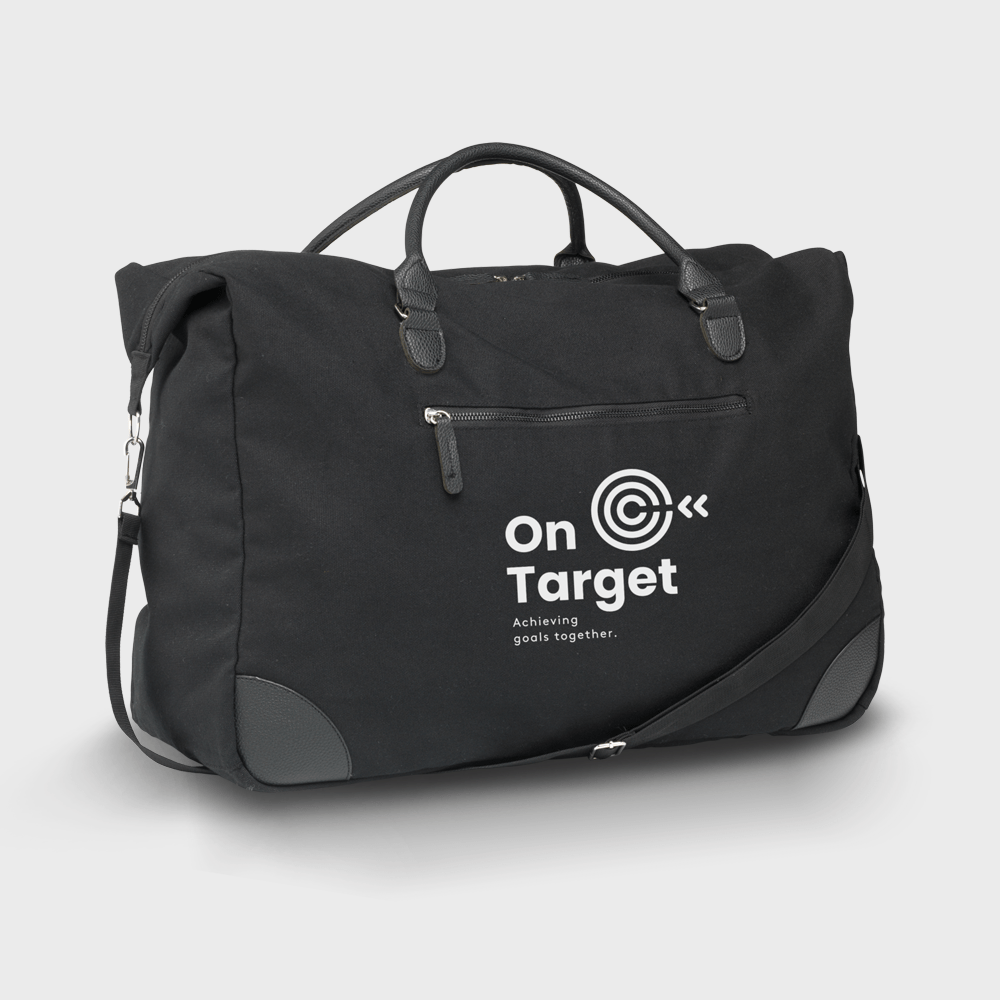 Ce sac de week-end pratique est fabriqué à partir de toile recyclée, ce qui lui confère un aspect robuste et moderne. Il est suffisamment spacieux pour contenir tous vos essentiels et comporte des poches zippées supplémentaires à l'intérieur et à l'extérieur pour les petits objets. Doté de solides poignées en PU recyclé et d'une bandoulière amovible et réglable en polyester RPET, il a été conçu pour être confortable et durable. Parfait pour les voyages courts ou les week-ends, ce sac est magnifiquement doublé de polyester RPET.
