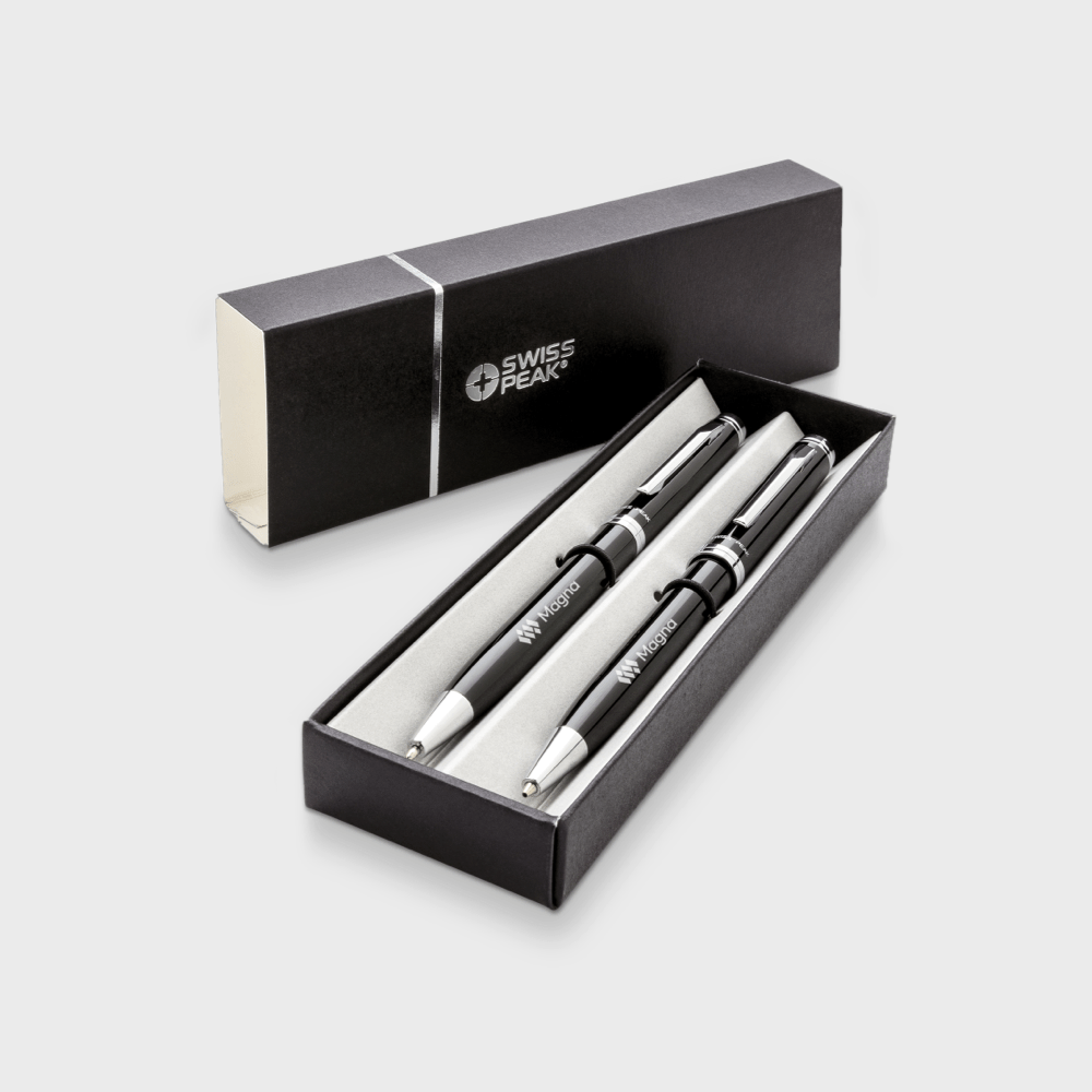 Le Set stylo et crayon suisses est une touche unique, élégante et sophistiquée. Le set, particulièrement élégant, comprend un stylo à bille à écriture douce et un crayon pratique. Le stylo écrit à l’encre bleue et est livré avec une recharge d’encre 1200m. Le crayon est équipé de 3 mines de 0,7 mm. Le tout est joliment présenté dans une boîte cadeau Swiss Peak. Personnalisez avec votre logo ou votre message et commandez dès aujourd’hui.