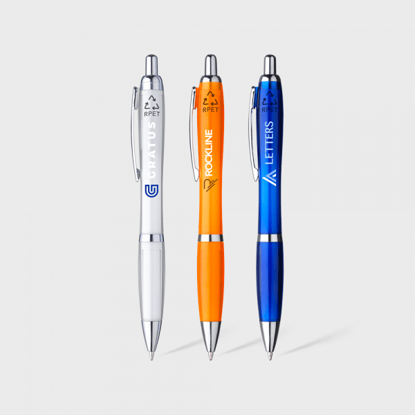 Superbe stylo-bille avec un corps transparent en RPET, fabriqué à partir de bouteilles PET recyclées. Il dispose également d'accents très brillants et d'un clip en métal robuste. Parfait pour écrire des notes à la maison ou au bureau.