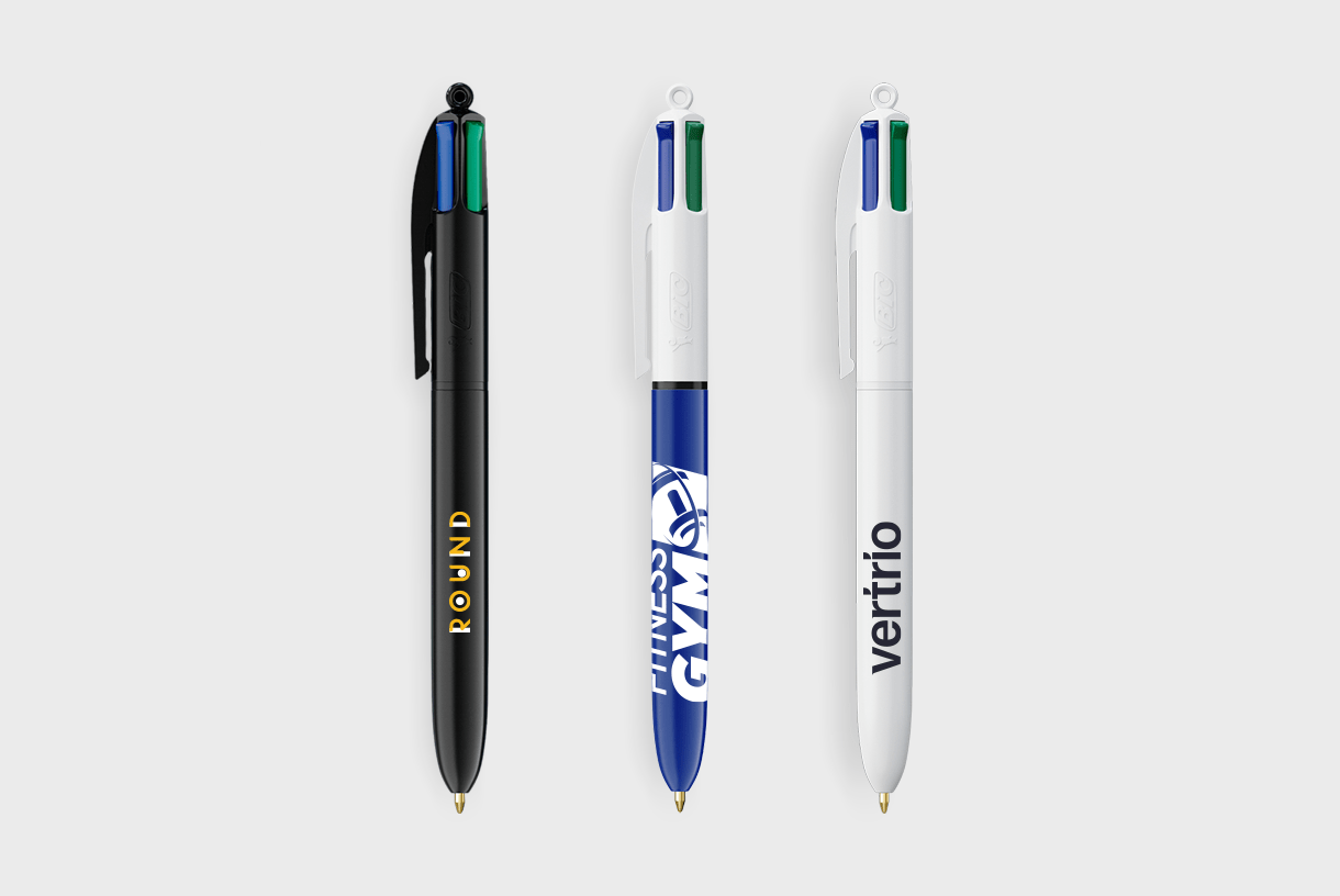 Quatre couleurs d'encre en une seule ! Ce stylo emblématique BIC® 4 Colours® offre la commodité d'une encre noire, bleue, rouge et verte dans un seul stylo. Désormais encore plus durable, il présente une réduction de 13 % de plastique sur le dessus. Imprimez en quadrichromie avec Britepix™ Digital de haute qualité pour un look personnalisé qui se démarque.