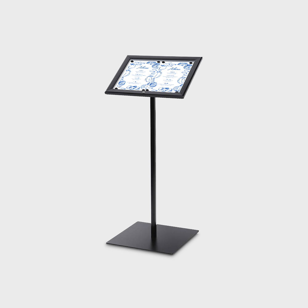 Le support de menu verrouillable noir est une vitrine élégante avec une façade à charnières verrouillable. Adapté aux espaces intérieurs et extérieurs couverts, il est idéal pour les menus, les listes de prix ou les offres quotidiennes. Placez vos pages en toute sécurité dans la vitrine en aluminium à l'aide d'aimants, et améliorez la visibilité grâce aux bandes LED en option. Parfait pour les restaurants, cafés et magasins.